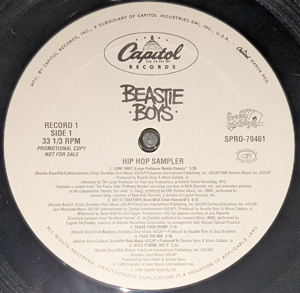 Issued by Capitol as a 2×LP promo, this black-vinyl set is one of the more prized Beastie collectibles. More than just a label sampler, it’s stacked with heavyweight remixes from hip-hop royalty — Large Professor, Buckwild, and DJ Muggs (Soul Assassins) — giving alternate life to cuts like “Sure Shot,” “Pass the Mic,” “Root Down,” “Shadrach,” and “Get It Together.” Clean edits make it DJ-friendly, but the draw is the pedigree: a limited-run promo that captures the Beasties at their peak while handing the reins to some of the era’s sharpest producers. A must have for those who prefer the Beastie's more hip hop leaning songs.